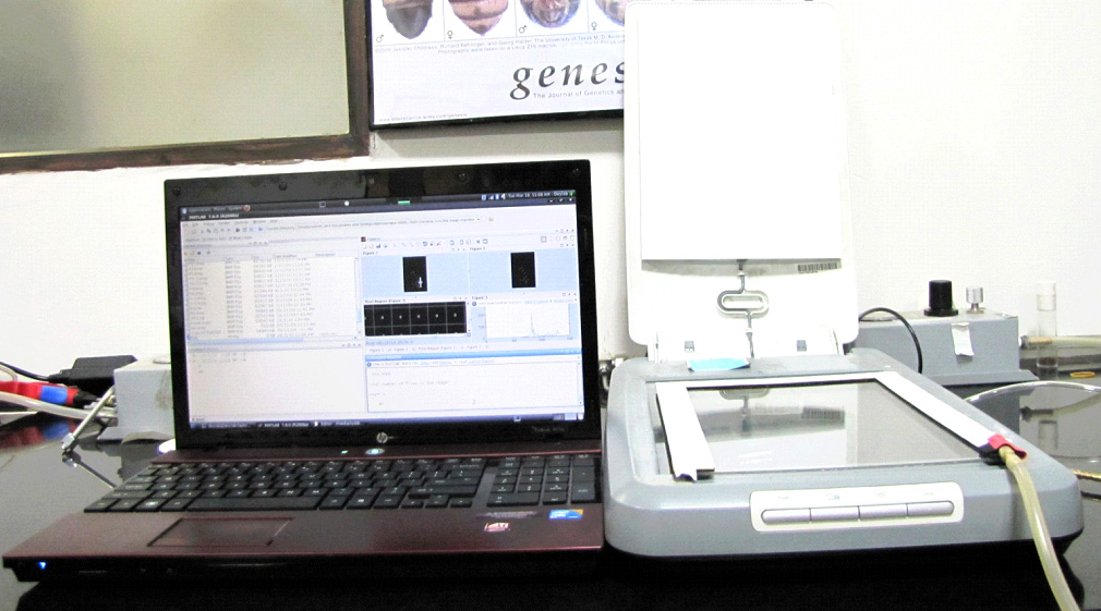 Experimental set-up: A transparent acrylic sheet is placed on the scanner bed. Along the sides of the sheet is a rubber channel connected to carbon dioxide supply at one end. The gas passes through regularly placed holes on the channel. This arrangement keeps the flies anesthetized while scanning. The scanned image is then passed on to the FlyCounter software which analyzes the image to determine the number of flies.